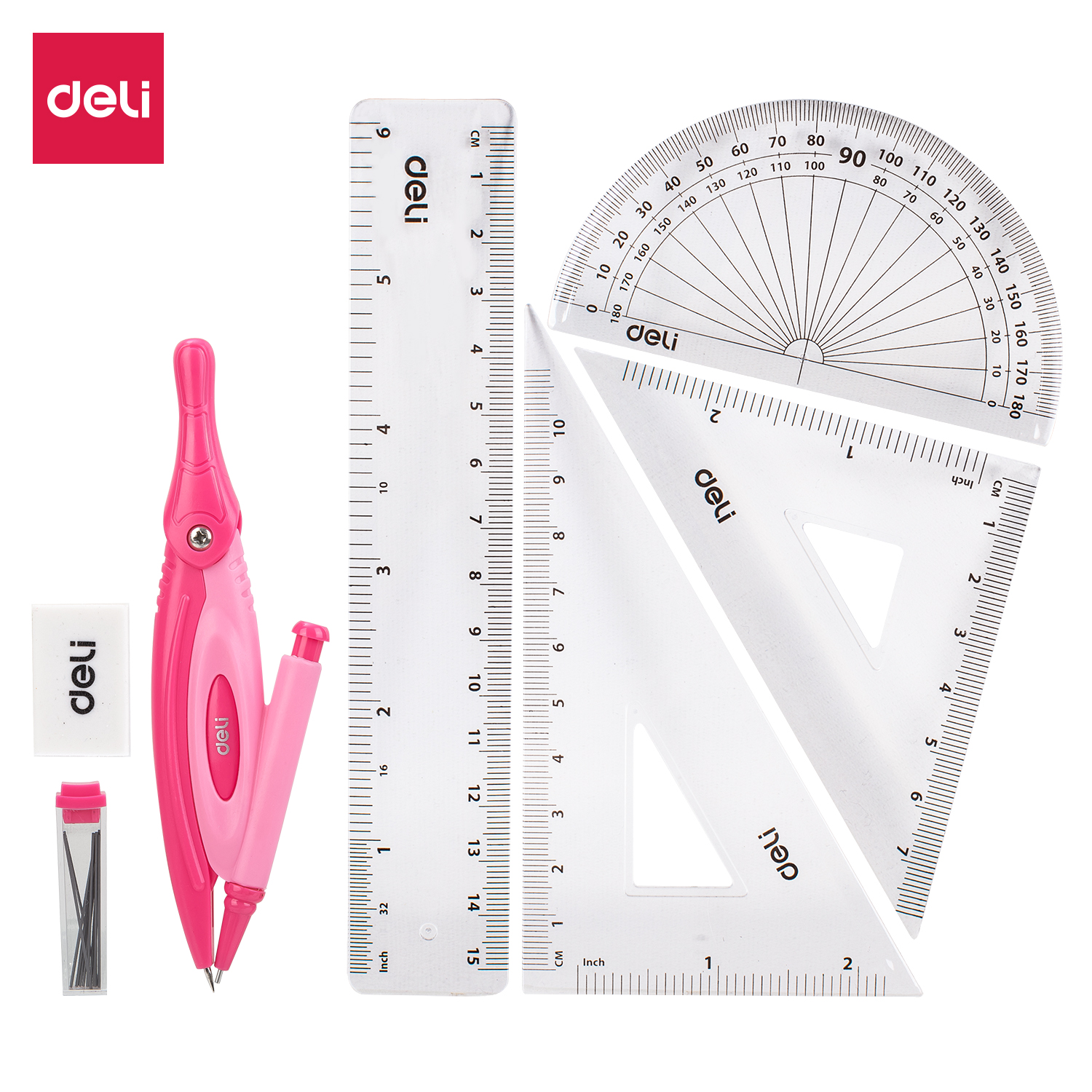 Упаковка: 15cm Ruler; 10cm 30/60/90 set square; 7cm 45/90 set square; protractor; Plastic Compass with 1 mechanic pencil; TPR Eraser; 1 box of mechanical pencil leads; Ø up to 280 mm; Dual color design; Peggable injection PS box;