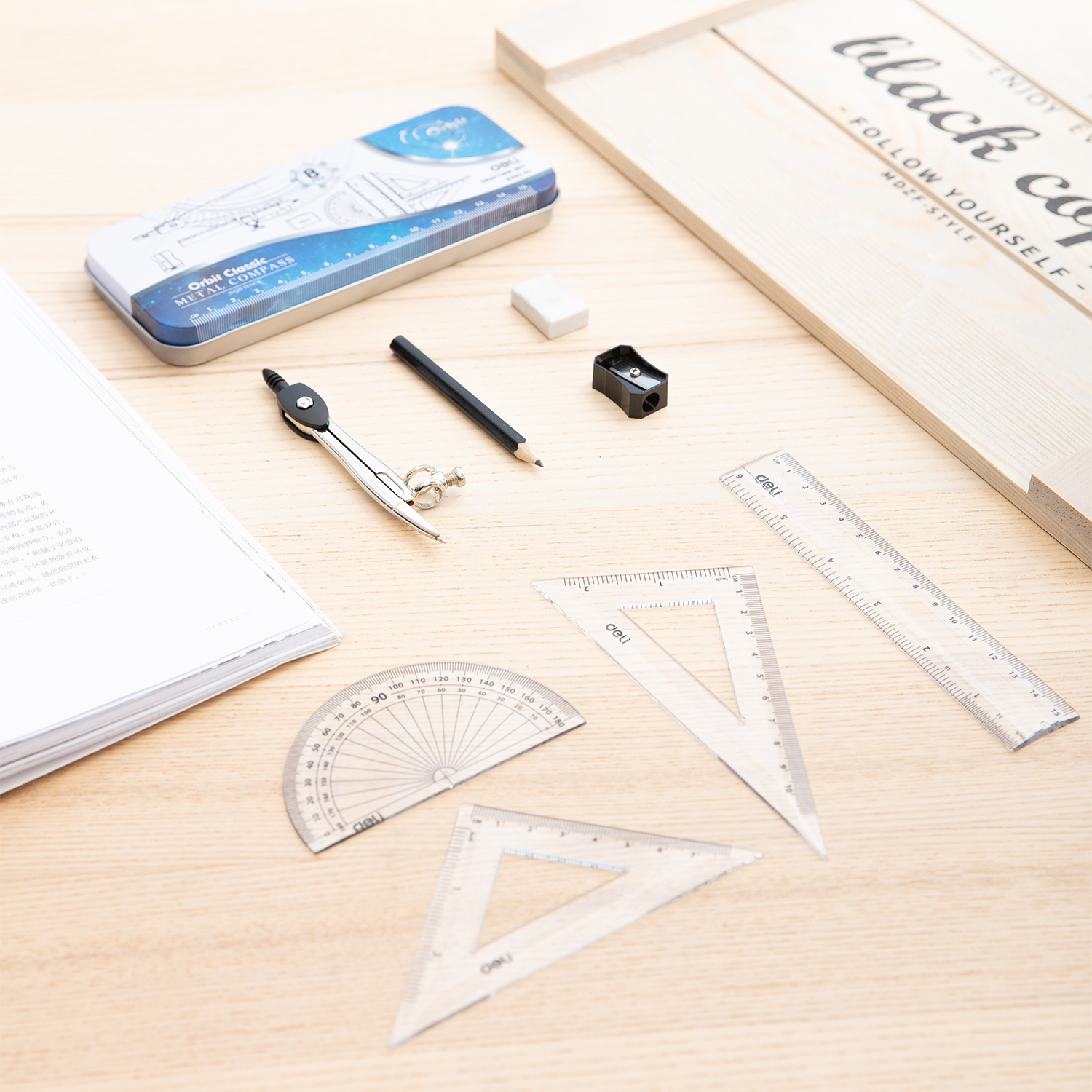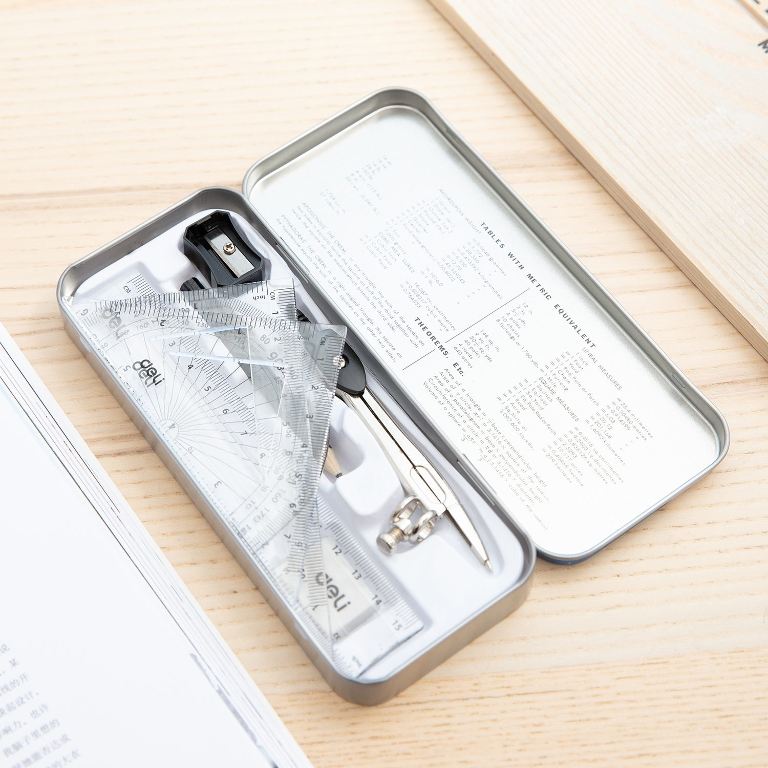 Упаковка: 15cm Ruler; 10cm 30/60/90 set square; 7cm 45/90 set square; protractor; Plastic Compass with 1 pencil; TPR Eraser; Plastic pencil sharpener; Ø up to 310 mm; Metal box;